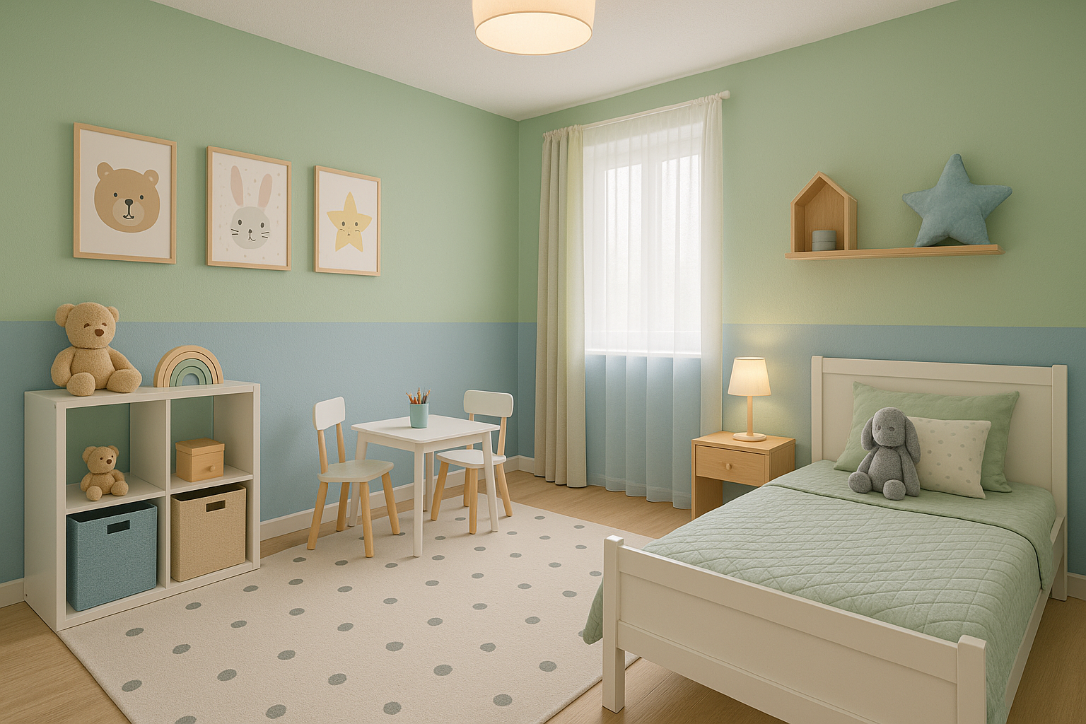 W projektowaniu przestrzeni dla dziecka priorytetem pozostaje stworzenie środowiska sprzyjającego koncentracji, odpoczynkowi i swobodnej eksploracji. Z punktu widzenia neuroestetyki i psychofizjologii koloru, zieleń oraz błękit mają właściwości redukujące napięcie i wspomagające procesy poznawcze. Zieleń – jako odcień związany z naturalnym środowiskiem – wpływa na stabilizację emocjonalną, natomiast niebieski wprowadza wrażenie ładu i przewidywalności.